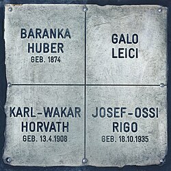 | Erinnerungsstein für Baranka Huber, Galo Leici, Karl-Wakar Horvath, Josef-Ossi Rigo | Christian Michelides | Christian Michelides | Datei:Erinnerungsstein für Baranka Huber, Galo Leici, Karl-Wakar Horvath, Josef-Ossi Rigo.JPG | |