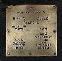 | Gisela Dlabaja geb. Jellinek wurde am 17. Juni 1896 in Boskowitz bei Brünn geboren. Sie heiratete am 15. November 1917 den Straßenbahner Albert Dlabaja. Das Paar hatte einen Sohn, Erich Dlabaja (1920–1970). Nach der Annexion Österreichs durch das sogenannte Dritte Reich sah sich die Familie zahlreichen Schikanen ausgesetzt. Da sie Jüdin war, musste ihr Sohn als sogenannter Mischling 1. Grades vom Gymnasium in die Handelsschule wechseln. Laut Enkelsohn Albert musste sie mit einer Bürste Gehsteige von aufgemalten Kruckenkreuzen säubern. Ihr Ehemann und ihr Sohn waren beide im Widerstand tätig, Erich gehörte dem Kommunistischen Jugendverband Österreichs an. Beide wurden am 13. Oktober 1939 von der Gestapo verhaftet, verhört und in der Folge in Konzentrationslager verschleppt. Erich Dlabaja wurde am 21. Januar 1941 wegen Vorbereitung zum Hochverrat zu zwei Jahren Zuchthaus verurteilt und in das Gefangenenlager Rodgau 1 im hessischen Dieburg gebracht. Nach Verbüßung der Jugendhaft wurde ihr Sohn in das KZ Buchenwald überstellt, wo er bis zu seiner Befreiung am 11. April 1945 blieb.[8][9][11] | |||