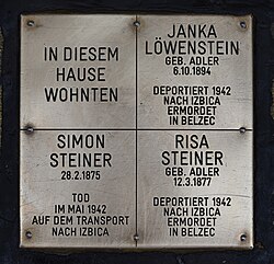 | Erinnerungsstein für Janka Löwenstein sowie Simon und Risa Steiner | Christian Michelides | Christian Michelides | Datei:Erinnerungsstein für Janka Löwenstein, Simon und Risa Steiner.JPG | |