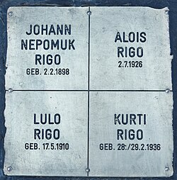 | Erinnerungsstein für Johann Nepomuk, Alois, Lulo und Kurti Rigo | Christian Michelides | Christian Michelides | Datei:Erinnerungsstein für Johann Nepomuk, Alois, Lulo und Kurti Rigo.JPG | |