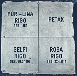 Lulo Rigo wurde am 17. Mai 1910 geboren. Er war verheiratet mit Malina (Mala) und hatte drei Kinder. Er wurde ins Zigeuner-Anhaltelager Lackenbach deportiert und schließlich ins Zigeunerlager ins KZ Auschwitz deportiert. Als sich 1944 die Rote Armee näherte, wurde das Lager aufgelöst. Lulo war als arbeitsfähig für die Überstellung ausgewählt worden, doch beim Abmarsch sah er seine Frau, die nicht ausgewählt wurde und blieb bei ihr – Lulo Rigo wurde mit seiner Frau und seinen drei Kindern in Auschwitz ermordet. | ||