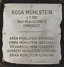 | Erinnerungsstein für Rosa Mühlstein, Aron Mühlstein, Emma Mühlstein, Richard Ullman, Herbert Mühlstein und Erika Mühlstein | Christian Michelides | Christian Michelides | Datei:Erinnerungsstein für Rosa Mühlstein.JPG | |