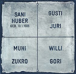| Erinnerungsstein für Sani Huber, Gusti Juri, Muni Zukro, Willi Gori | Christian Michelides | Christian Michelides | Datei:Erinnerungsstein für Sani Huber, Gusti Juri, Muni Zukro, Willi Gori.JPG |