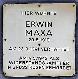 ERWIN MAXA 20.8.1910 AM 23.9.1941 VERHAFTET AM 4.5.1942 ALS WIDERSTANDSKÄMPFER IN GROSS ROSEN ERMORDET |