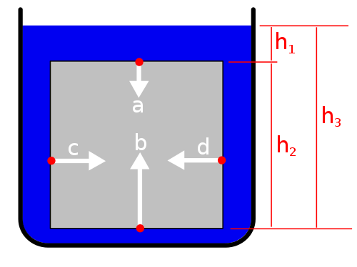 Die Auftriebskraft eines in einem Fluid eingetauchten Körpers kommt daher, dass der Druck eines Fluides im Schwerefeld, der sogenannte hydrostatische Druck, mit der Tiefe zunimmt,[5] also bei jedem ausgedehnten Körper „unten“ und „oben“ verschieden groß ist. Taucht beispielsweise ein quaderförmiger Körper mit seiner Grundfläche in ein Fluid ein, so ist der hydrostatische Druck an der Grundfläche (im Bild als b gekennzeichnet) größer als an der Oberseite (a).[5] Bei unregelmäßiger geformten Körpern ist die statische Auftriebskraft die resultierende Kraft aus den (vertikalen) Kraftanteilen der hydrostatischen Drücke, die an allen Oberflächenteilen angreifen.[5]