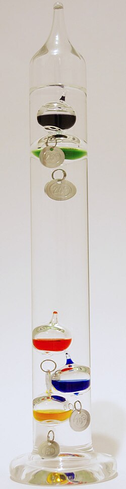 Ein Galileo-Thermometer zeigt anhand des Auftriebs verschiedener Körper in einer Flüssigkeit die Temperatur der Flüssigkeit an. Die dazu verwendeten Glaskugeln, deren Durchmesser größer ist als der halbe Innendurchmesser des Zylinders[17] (wodurch sie in der Schichtung bleiben und sich gegenseitig nicht „überholen“), wurden mithilfe von Flüssigkeiten so austariert, dass deren mittlere Dichte von der obersten Kugel zur untersten Kugel zunimmt. Da die Dichte der Flüssigkeit temperaturabhängig ist, ändert sich der Auftrieb entsprechend der Temperatur. Bei einer bestimmten Temperatur steigen alle Kugeln auf, deren mittlere Dichten kleiner sind als die mittlere Dichte der sie umgebenden Flüssigkeit ist. Alle Kugeln sinken ab, deren mittlere Dichten größer sind als die mittlere Dichte der sie umgebenden Flüssigkeit. Die aktuelle Temperatur kann an der angehängten Plakette der oben zuunterst schwimmenden Kugel abgelesen werden.[17] Erwärmt sich dann die Flüssigkeit, nimmt also ihre Dichte ab, so sinkt eine weitere Kugel ab und die neue Temperatur kann wieder an der angehängten Plakette der oben zuunterst schwimmenden Kugel abgelesen werden.