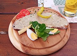 | Garniertes Steirerkasbrot, Blaa-Alm, Österreich | Eigenes Werk | Tigerente | Datei:Steirerkas Brot garniert 20200701.jpg |