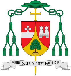 Unter dem Wappen steht sein bischöflicher Wahlspruch in deutscher Sprache: Meine Seele dürstet nach dir.
