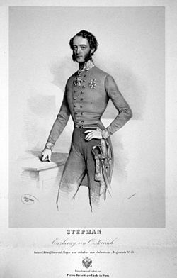 | Erzherzog Stephan von Österreich (1817-1867), Palatin von Ungarn | Eigenes Foto einer Originallithographie aus eigenem Besitz von Peter Geymayer ( Diskussion · Beiträge ) ursprünglich auf de.wikipedia hochgeladen (6. Juli 2008, 13:11). Der Dateiname war Stephan Erzherzog.jpg . | Josef Kriehuber / Nach Anton Einsle | Datei:Stephan Erzherzog.jpg |