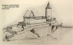 Hrad Šternberk - rekonstrukce pro dobu kolem 1350 | https://www.hrad-sternberk.cz/cs/o-hradu/historie | Národní památkový ústav | Datei:Hrad Šternberk-rekonstrukce-1350.jpg | |