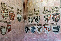 In der Wappengalerie der Wenzelburg in Lauf a.d. Pegnitz, entstanden als machtpolitische Repräsentation Karls IV. in »Neuböhmen« um das Jahr 1361, findet sich das sternbergische Wappen in seiner frühen Version inmitten einer Wappengruppe der vornehmsten böhmischen Herren von Ronov, von Rosenberg, von Wartenberg, von Michalowitz, von Landstein, von Hasenburg.[5]