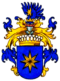 Blasonierung: Das Wappen zeigt in Blau einen achtzackigen goldenen Stern, den die Legende als Stern von Betlehem interpretiert. Die Helmzier ist auf dem gekrönten Helm mit blau-goldenen Decken ein geschlossener blauer Flug, zwischen dem der Stern hervorgeht.