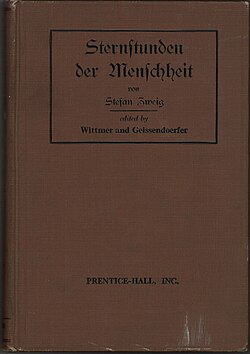 | Stefan Zweigː Sternstunden der Menschheit, New York, C. 1931, book cover | Eigenes Werk | Heied | Datei:IB 165-2 Stefan Zweig, Sternstunden, Prentice-Hall New York, City 1931.jpg | |