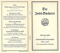 - ↑ Die Insel=Bücherei, Sommer 1935. Alphabetisches Verzeichnis Nr. 1 – 476. Insel Verlag, Leipzig 1935 (I.-V. 35.113)