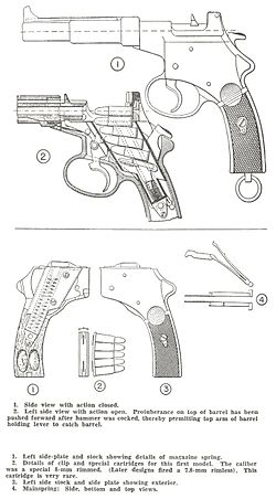 Die erste Pistole von Ferdinand Mannlicher, welche von FAB.D'ARMES Neuhausen in der Schweiz gefertigt wurde, war selbstladend und verwendete speziell eingefasste 6,5-mm-Patronen. Der mechanische Entwurf der Waffe war für damalige Waffen-Standards neuartig, da der Blow-Forward-Mechanismus für das Abfeuern der Waffe verwendet wurde. Normalerweise wurde bei automatischen Schusswaffen mit niedrigem Kaliber der Rückstoß verwendet, um den Hinterlader nach hinten zu bewegen. Mannlicher setzte aber einen starren Hinterlader ein, bei dem der Lauf „nach vorne stößt“.[2]