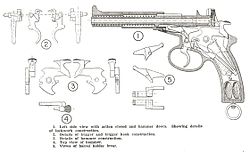 Eine weitere Besonderheit der Waffe war ein dreiarmiger Hebel, welchen man in der Abbildung auf der Seite 188 von Mannlicher Rifles and Pistols, Smith, 1947[2] sehen kann. Der untere Arm war in den Abzug der Waffe eingerastet. Der vordere Arm hielt den Lauf für das Nachladen der Waffe. Der hintere Arm diente als Schlagstück-Sicherung.