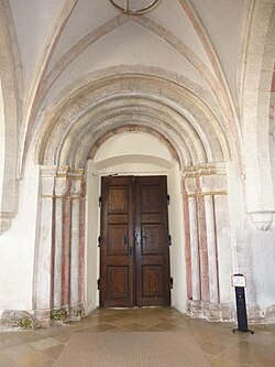 | Pfarrkirche Mariä Himmelfahrt, ehem. Zisterzienserstiftskirche, Stift Baumgartenberg, Oberösterreich - romanisches Portal von der frühgotischen Kirchenvorhalle zur Kirche Dieses Bild zeigt das in Österreich unter der Nummer 80340 denkmalgeschützte Objekt. ( Commons , de , Wikidata ) | Eigenes Werk | BSonne | Datei:Stiftskirche Baumgartenberg03.jpg | |