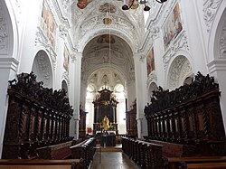 Das von unbekannten Meistern hergestellte Chorgestühl vom Ende des 17. Jahrhunderts ist kunstvoll geschnitzt und mit reichem Akanthusrankenwerk ausgestattet, hat prachtvolle Wangen und Fruchtgehänge. Die beiden Wappen stellen das Abt- und das Stiftwappen dar. Die ebenfalls aus dieser Zeit stammende Kanzel zeigt den heiligen Bernhard.