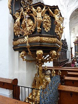 | Pfarrkirche Mariä Himmelfahrt, ehem. Zisterzienserstiftskirche, Stift Baumgartenberg, Oberösterreich - Statue hl. Bernhard am Kanzelfuß (Motiv Wurzel Jesse; Zweige zu Medaillons zu Heiligen des Zisterzienserordens) Dieses Bild zeigt das in Österreich unter der Nummer 80340 denkmalgeschützte Objekt. ( Commons , de , Wikidata ) | Eigenes Werk | BSonne | Datei:Stiftskirche Baumgartenberg Kanzel11.jpg |