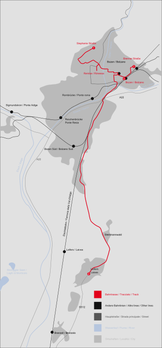 Die Linie 2 wurde in mehreren Bauabschnitten errichtet, da die Betreiber der Etschtalbahn die Konkurrenz fürchteten. Doch lag der Bahnhof Leifers so weit vom Ort entfernt, dass er für die lokale Bevölkerung nutzlos war. Eine direkt bis in den Ort fahrende Straßenbahn war bedeutend angenehmer. Von Leifers folgte die Bahn dem Verlauf der Brennerstraße bis zur Unterführung kurz vor dem Virgltunnel, um zur Trienter Straße wechseln zu können. Von hier aus gelangte die Bahn über den Dominikanerplatz auf den Waltherplatz und in das Gleis der Linie 1 und der Rittner Bahn. Kurz vor dem Bahnhof Bozen fädelte die Linie wieder aus und gelangte zu einem eigenen Endbahnhof südlich des Haupteinganges.