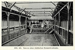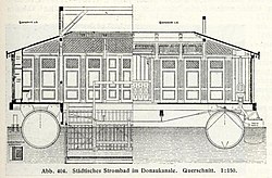 | Städtisches Strombad im Wiener Donaukanal - Querschnitt. | Wien am Anfang des XX. Jahrhunderts – Ein Führer in technischer und künstlerischer Richtung (2. Band), herausgegeben vom Österreichischen Architekten-Verein, Verlag von Gerlach & Wiedling, Wien, 1906 | unbekannter Fotograf | Datei:GuentherZ 0008 Wien Staedtisches Strombad Donaukanal Querschnitt.jpg | |