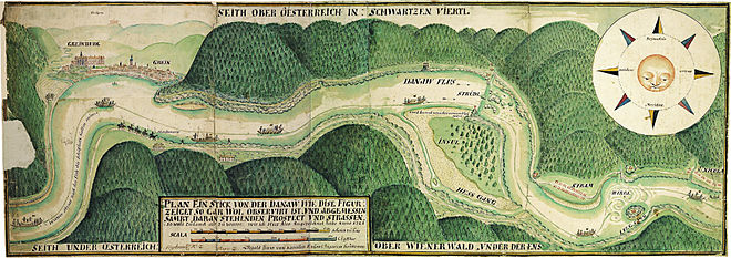 Nach und nach wurde durch Regulierungsmaßnahmen der Fluss gezähmt. Unter Kaiserin Maria Theresia begann etwa 1770 und 1780 die Beseitigung besonders gefährlicher Felsen an der „Bösen Beuge“ (siehe Donauschlinge bei Ybbs), der Greiner Strudel, der Strudel bei Struden,[12] und der Wirbel im Strudengau. Dabei wurde auch die Burg Wörth großteils gesprengt.