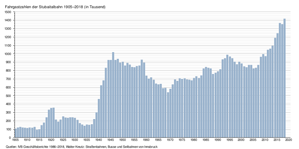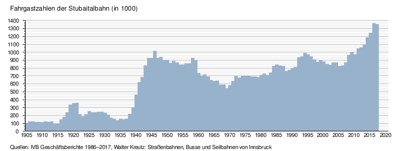 Diese Grafik zeigt die Entwicklung des Fahrgastaufkommens der Stubaitalbahn zwischen 1905 und 2020.[19][23] Die Fahrgastzahlen ab 2002 sind in der folgenden Tabelle zusammengefasst: