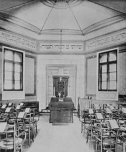 Innenansicht der Synagoge im Alten AKH (jetzt Campus der Universität Wien) errichtet im Jahre 1903. Veröffentlicht ebenfalls im Jahre 1903. | Der Bautechniker, 14. August 1903 | Max Fleischer, architect | Datei:Synagoge AKH Vienna 1903 interior view.jpg | |
