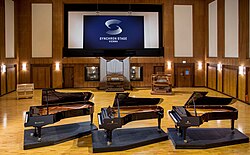 | v.l.n.r. vorne: Bösendorfer Imperial 290, Steinway & Sons D-274 Hamburg Model, Yamaha Disklavier CFX EN PRO. hinten rechts: denkmalgeschützten "Lenkwil" Kinoorgel. hinten mitte: Molzer Orgel. Stage A, Synchron Stage Vienna. | Eigenes Werk | Aylin007 | Datei:Tasteninstrumente der Synchron Stage Vienna, inkl. der denkmalgeschützten Kinoorgel (rechts hinten).jpg |