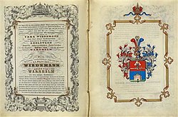 | Wappen aus dem Adelsdiplom von Franz Joseph I. (Kaiser von Österreich 1848-1916) für Carl Wiedemann, Major des Linien Infanterie Regiments Nr. 56, mit Verleihung des Prädikates "Edler von Warnhelm". Text des Adelsdiploms mit ausführlicher Würdigung der militärischen Biographie des 1804 in Zara in Dalmatien (Zadar, Kroatien) geborenen Adelstandserwerbers (" ... Zu Unserer besonderen Zufriedenheit haben wir auch erfahren, daß Carl Wiedemann den Feldzug in Italien im Jahre 1848 mitgemacht, am Isonzo gefochten, bei den Einnahmen von Udine, von Vicenza, in der Schlacht von Custozza, dann bei den Affairen Volta und Mailand Theil genommen und sich stets brav gehalten habe. Bei Custozza leicht blessiert, wurde er im Armeebefehle Unseres Feldmarschalls Grafen Radetzky vom 19 September 1848für Tapferkeit und Wohlver halten öffentlich belobt ... "). Adelsdiplom ausgestellt Wien, 23. November 1852, mit eigenhändiger Unterschrift des Kaisers, Gegenzeichnung Inneminister Alexander von Bach und Ministerialrat Friedrich Sachse von Rothenberg. Pergamentlibell, 7 Seiten, gestochene Bordüre, goldgehöhte Kalligraphie, Wappendarstellung, MoireInnenspiegel mit goldgeprägter Bordüre. Roter Samteinband mit Blindprägung und goldgeprägter Doppeladlerdarstellung, anhängendes Siegel in Metallkapsel. | Dorotheum | Anonym Unknown author | Datei:Adelsdiplom - Wiedemann von Warnhelm 1852.jpg | |