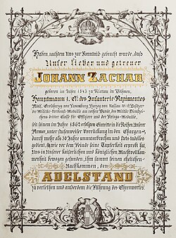 | Seite aus dem Adelsdiplom von Franz Joseph I. (Kaiser von Österreich 1848-1916) für Hauptmann Johann Zachar, mit Verleihung des Prädikates "Edler von Radimil" aufgrund mehr als 30-jähriger Dienstzeit. Ausgestellt Wien 1893, mit eigenhändiger Unterschrift des Kaisers, Gegenzeichnung Eduard Graf Taaffe. Pergamentlibell (Format ca. 38 x29 cm), teils goldgehöhte Kalligraphie, gedruckte Bordüre. Wappendarstellung signiert " Carl Boess ". Violetter Samteinband mit goldgeprägter Doppeladlerdarstellung, anhängendes Siegel in Messingkapsel. Adelsdiplom und Unterlagen in Metallkassette (Format 53 x 30 cm). | Adelsdiplom Zachar von Radimil 1893 | Anonym Unknown author | Datei:Adelsdiplom - Zachar von Radimil (1893) 02.jpg | |