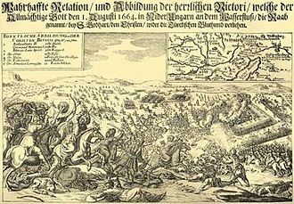 Nach der Eroberung der Festung Neu-Zrin marschierte die osmanische Hauptarmee Richtung Wien, wurde aber an der Raab zwischen Mogersdorf und dem Zisterzienserkloster St. Gotthard von der Hauptarmee Montecuccolis aufgehalten. Die am 1. August 1664 stattfindende Schlacht endete überraschend mit einem Sieg der Kaiserlichen: Die Osmanen konnten nur ca. 12.000 Mann über die Hochwasser führende Raab bringen[4], die nach anfänglichen Erfolgen von einem Gegenangriff der kaiserlichen Kürassiere unter Graf Johann von Sporck vernichtet wurden.