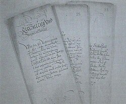 | Einzelne Rechnungshefte aus dem Türkensteuerregister von 1605 | Thomas Heiler: Das Türkensteuerregister der Fürstabtei Fulda von 1605 , ( Veröffentlichung des Fuldaer Geschichtsvereins in den Fuldaer Geschichtsblättern ; Nr. 64), Fulda, Parzeller-Verlag, 2004, ISBN 3-7900-0362-X | Autor/-in unbekannt Unknown author | Datei:Türkensteuerregister 1 001.jpg | |