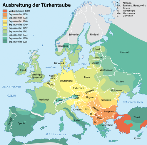 - ↑ Wolfgang Baumgart: Die Ausbreitung der Türkentaube (Streptopelia decaocto) als Folge politischer und wirtschaftlicher Entwicklungen auf dem postosmanischen Balkan - Retrospektive und Wertungen. Band 10, 2000, S. 12.