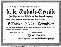 | Advertisement for the Waaghaus Tababtrafik in Bozen-Bolzano, "Bozner Nachrichten" 1915 | Advertisement from 1915 | Bozner Nachrichten 1915 | Datei:BZN 1915 07 18 8 Tabaktrafik Waaghaus.png | |