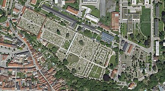 | Der Taborfriedhof im 17. Jahrhundert. Hier sind noch der ehemalige quadratische Grundriss und der hintere Torturm zu sehen. Ausschnitt aus der Steyrer Stadtansicht in Matthäus Merians Topographia Provinciarum Austriacarum | Diese Datei ist ein Ausschnitt aus einer anderen Datei | Matthäus Merian | Datei:Campo Santo Steyr - Merian 1679.jpg | |