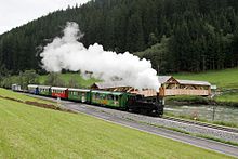 | Dampfsonderzug mit Lokomotive S.12 auf der Murtalbahn zwischen Madling und Tamsweg | Selbst fotografiert | Herbert Ortner , Vienna, Austria | Datei:Murtalbahn near Tamsweg.jpg | |