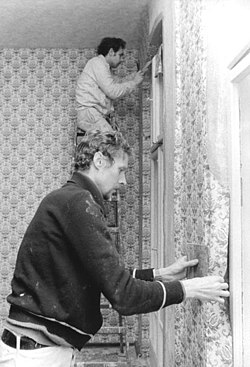 | Es folgt die historische Originalbeschreibung , die das Bundesarchiv aus dokumentarischen Gründen übernommen hat. Diese kann allerdings fehlerhaft, tendenziös, überholt oder politisch extrem sein. Berlin, Jugendbrigade Dieter Wagenknecht, Tapezierer ADN-ZB Settnik 26.11.84 Berlin: Rekonstruktion-In der Jessnerstraße 5 tapezieren die Maler Jürgen Schütt (vorn) und Jürgen Losch, Mitglieder der Jugendbrigade Dieter Wagenknecht, eine der 14 Wohnungen. Die Wohnhäuser, die sich im Modernisierungskomplex Frankfurter Allee Süd befinden, sind um die Jahrhundertwende entstanden. Für viele Familien entsteht jetzt ein neues, schönes Zuhause. Bisher hat die Jugendbrigade in diesem Jahr 130 Wohnungen fertiggestellt, 14 sind laut Plan noch zu schaffen. | Dieses Bild wurde im Rahmen einer Kooperation zwischen dem deutschen Bundesarchiv und Wikimedia Deutschland aus dem deutschen Bundesarchiv für Wikimedia Commons zur Verfügung gestellt. Das deutsche Bundesarchiv gewährleistet eine authentische Bildüberlieferung nur durch die Originale (Negative und/oder Positive), bzw. die Digitalisate der Originale im Rahmen des Digitalen Bildarchivs . | Bernd Settnik | Datei:Bundesarchiv Bild 183-1984-1126-029, Berlin, Jugendbrigade Dieter Wagenknecht, Tapezierer.jpg | |