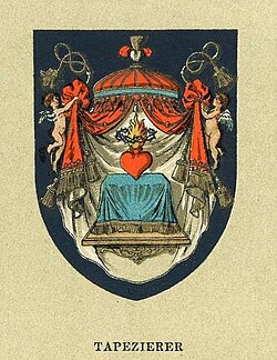 | Wappen der Tapezierer (Wappen der Wiener Gewerbegenossenschaften, um 1900) | http://peter-diem.at/ – http://oktogon.at/Wiener_Gewerbe/index.html | Hugo Gerard Ströhl | Datei:Wiener Gewerbewappen Tapezierer.jpg |
