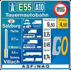 Im Bereich des Tauern- und Katschbergtunnels ist die Strecke eine Sondermautstrecke.[2] In diesem Bereich entfällt für die Kraftfahrzeuge bis 3,5 Tonnen die Vignettenpflicht, anstelle derer eine Streckenmaut zu entrichten ist. Die Maut kann entweder in bar, mit Kreditkarte, Tankkarte oder Maestro-Card (Bankomatkarte) an der Mautstelle bezahlt werden. Alternativ kann die Mautgebühr auch über das Videomaut-System im Voraus bezahlt werden. Für Vielfahrer besteht außerdem die Möglichkeit, eine Jahreskarte zu erwerben. Für einheimische Pendler entfällt die Maut.
