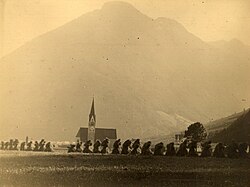 Val di Tures con la chiesa Santa Maria Assunta: Paesaggio Con Una Fila Di Covoni Di Grano In Primo Piano; 1936; stampa alla gelatina bromuro d'argento camoscio ilford; 176X234 | http://93.62.170.226/foto/gabinio/121B12.jpg | Mario Gabinio | Datei:Gabinio.Val Di Tures. Paesaggio Con Una Fila Di Covoni Di Grano In Primo Piano 121B12.jpg | |