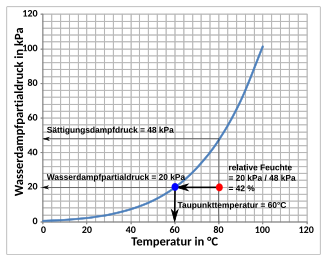 Die relative Luftfeuchtigkeit ist das Verhältnis von Partialdruck des Dampfes zu dessen Sättigungsdampfdruck .[19]