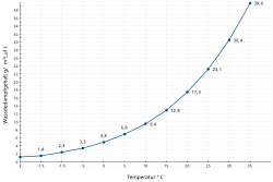 | Das Diagramm zeigt die Temperaturabhängigkeit der maximalen Sättigungsfeuchte von Luft. | Eigenes Werk | Retemirabile | Datei:Taupunktkurve.svg |