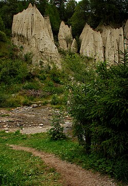 Mit den Erdpyramiden verbunden ist ein Ereignis, das den Ort im Jahr 1837 besonders berührte; das Material, aus dem diese entstanden, stammt aus Moränenablagerungen aus der letzten Eiszeit. Die Ablagerungen sind im unteren Bereich mit größeren Steinen und Blöcken aus Granit und Schiefer zersetzt, im oberen Bereich stammt es aus leicht erodierbarem Material. Im besagten Jahr 1837 wurde die Gegend durch ein gewaltiges Unwetter berührt, durch dessen Folge der Terner Bach 3 Wohnhäuser, 16 Mühlen, 13 Stampfen, eine Schmiede sowie eine Säge mit sich fortriss, wobei 13 Menschen zu Tode kamen. Durch das Unwetter kam es zum Anbruch des Hanges; aus dem Material, welches mit Steinen und Blöcken zersetzt war, kam es in Folge durch weitere Erosionen zu den heute als Sehenswürdigkeiten bestaunten Erdpyramiden. Wo keine Steine inbegriffen waren, können heute Grate und Rippen bestaunt werden. Durch die Verbauung des Terner Baches ist eine weitere Vertiefung der Erdpyramiden nicht mehr möglich (Quelle: Infotafel an der Jausenstation Jennewein).