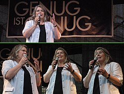 | Austrian politician Terezija Stoisits speaking in front of some ~10.000+ persons who are demonstrating against actual Austrian 'policy' on asylum rights. This event was supported by a considerable quantity of renowned Austrian artists, writers and politicians. Please note that camera's time stamp is set to UT, which is local CEST -2h. | Eigenes Werk | W. | Datei:Genug ist Genug - Vienna 20090701 Terezija Stoisits.jpg | |