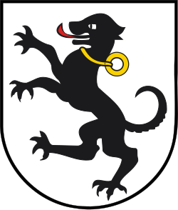 Blasonierung: „In Silber ein rechtsspringender schwarzer Hund mit roter Zunge, goldenem Halsband und goldenem Ring daran.“[15][16] |