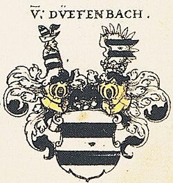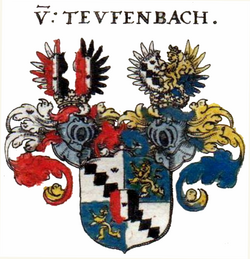Das Adelsgeschlecht derer von Teuffenbach (auch Teuffenpach, Teufenbach, Tiefenbach, Düefenbach) wurde zum niederösterreichischen landständischen Adel gezählt bzw. als „steiermärkischer Uradel aus gleichnamigen Stammhause bei Nieder-Wölz [Niederwölz]“ beschrieben.[1] Nierwölz ist heute eine Gemeinde im heutigen Bezirk Murau in der Steiermark und liegt neben Teufenbach-Katsch, welche Teufenbach, Katsch an der Mur und Frojach als Ortschaften zusammenfasst. Der erste Hauptstamm Teuffenbach-Mairhofen (Teuffenbach-Mayrhofen) ist im Mannesstamm erloschen, der zweite Hauptstamm Teuffenbach-Teufenbach (Tiefenbach) besteht noch.[1][2]