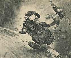 | Dramatischer Augenblick von der Mille Miglia an der Theo Matejkos selbst teilnahm. Der vor ihm fahrende Wagen stürzt über eine Böschung. | Das Theo Matejko Buch | Theo Matejko | Datei:Matejko, Mille Miglia, 1931.jpg | |