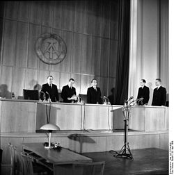| Es folgt die historische Originalbeschreibung , die das Bundesarchiv aus dokumentarischen Gründen übernommen hat. Diese kann allerdings fehlerhaft, tendenziös, überholt oder politisch extrem sein. Berlin, Oberländer-Prozess Zentralbild/Hesse29.4.1960Oberländer-Prozeß in BerlinDas Oberste Gericht der DDR hat den Bonner Minister Oberländer zu lebenslänglichem Zuchthaus verurteilt. Die Urteilsverkündung erfolgte am 29.4.1960 nach sieben Verhandlungstagen. U.B.z.: Im Namen des Volkes verkündete Gerichtsvorsitzender Dr. Jahn (2.v.l.) das Urteil | Dieses Bild wurde im Rahmen einer Kooperation zwischen dem deutschen Bundesarchiv und Wikimedia Deutschland aus dem deutschen Bundesarchiv für Wikimedia Commons zur Verfügung gestellt. Das deutsche Bundesarchiv gewährleistet eine authentische Bildüberlieferung nur durch die Originale (Negative und/oder Positive), bzw. die Digitalisate der Originale im Rahmen des Digitalen Bildarchivs . | Rudolf Hesse | Datei:Bundesarchiv Bild 183-72704-0001, Berlin, Oberländer-Prozess.jpg | |
