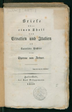 | Briefe über einen theil von Croatien und Italien an Caroline Pichler | Verfügbar in der digitalen Bibliothek der Europäischen Bibliothek für Information und Kultur (BEIC) und hochgeladen im Rahmen einer Partnerschaft mit der BEIC . | Artner, Therese : von | Datei:Briefe über einen theil von Croatien und Italien an Caroline Pichler.tif | |